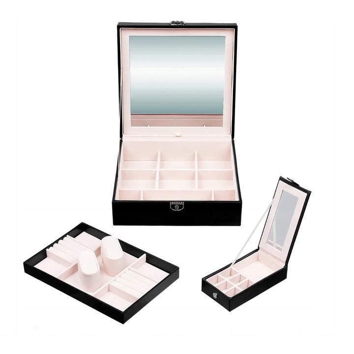 CAPACITATE MARE - cutia este formata dintr-o husa detasabila cu 2 compartimente cu role pentru inele, 4 compartimente pentru alte bijuterii, o caseta detasabila. Dedesubt exista 6 compartimente suplimentare, 2 insertii pentru ceasuri sau bratari si 1 compartiment mare, dreptunghiular, pentru articole mai mari. Compartimentele sunt captusite cu un material moale pentru a proteja bijuteriile delicate de zgarieturi.