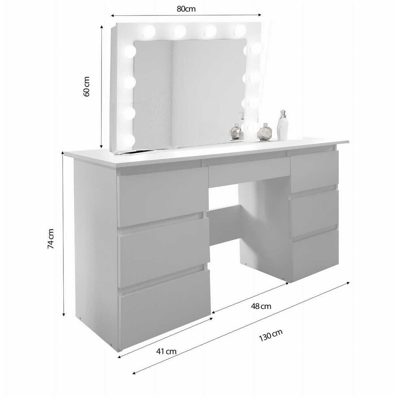 Este o piesa de mobilier eleganta si practica, proiectata pentru a satisface nevoile si preferintele persoanelor care cauta un spatiu dedicat pentru a-si ingriji frumusetea si a-si stoca cosmeticele si bijuteriile. Aceasta masa este prevazuta cu o oglinda mare si 12 lumini LED incorporate, ceea ce o face ideala pentru aplicarea machiajului sau coafurii.