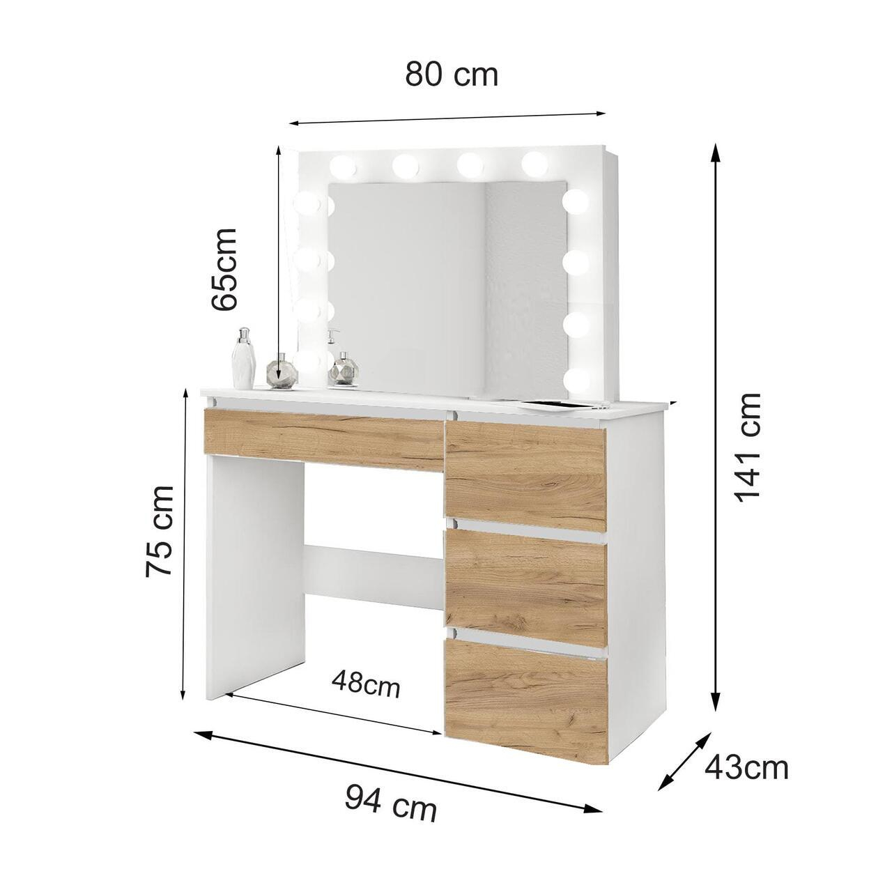 Masa de toaleta/machiaj, alb si stejar Wotan, cu oglinda si LED-uri, Irina, 94x43x141 cm