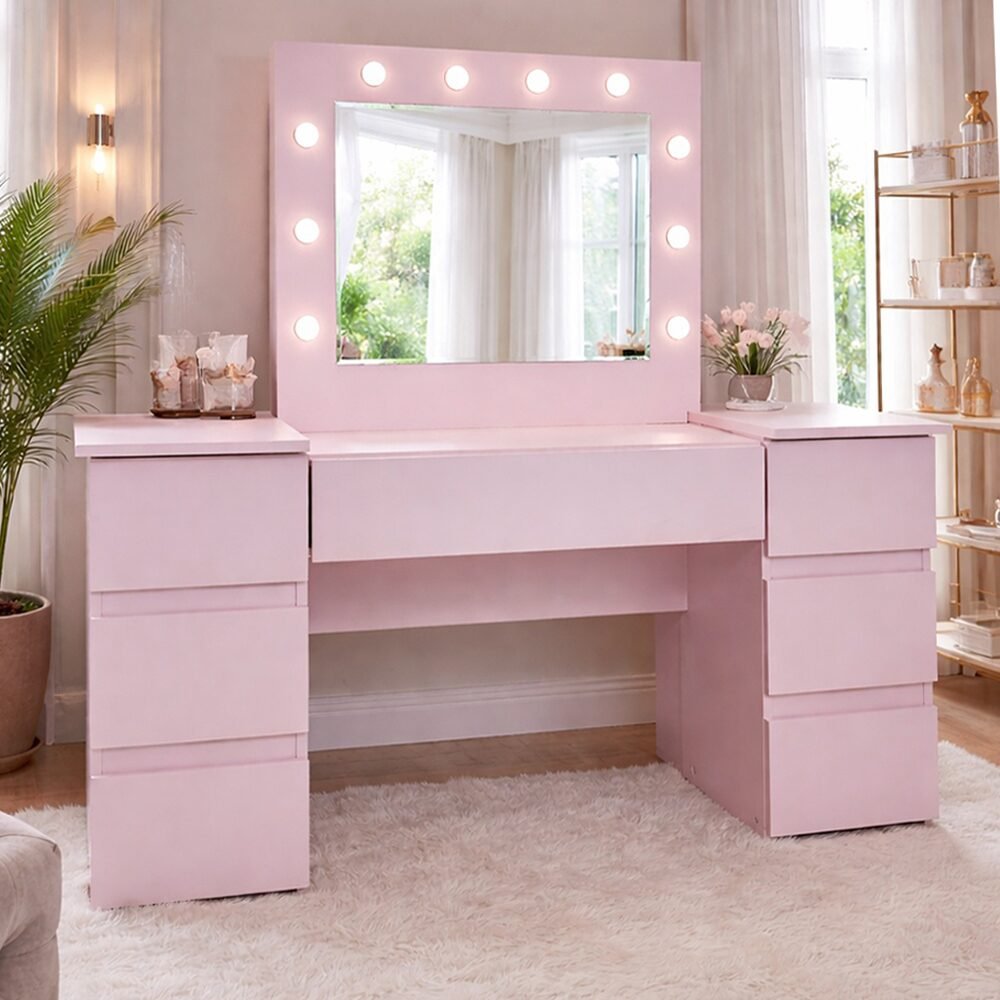 Oglinda mare incorporata in masa de toaleta/machiaj ofera o imagine clara si detaliata, ceea ce faciliteaza aplicarea machiajului si coafurii.