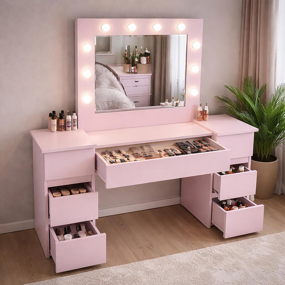Este o piesa de mobilier eleganta si practica, proiectata pentru a satisface nevoile si preferintele persoanelor care cauta un spatiu dedicat pentru a-si ingriji frumusetea si a-si stoca cosmeticele si bijuteriile. Aceasta masa este prevazuta cu o oglinda mare si 10 lumini LED incorporate, ceea ce o face ideala pentru aplicarea machiajului sau coafurii.