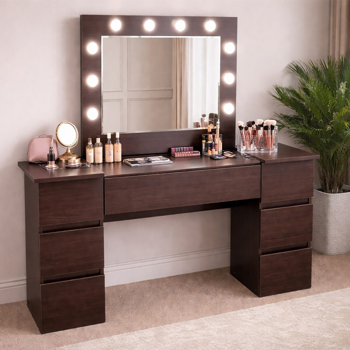 Este o piesa de mobilier eleganta si practica, proiectata pentru a satisface nevoile si preferintele persoanelor care cauta un spatiu dedicat pentru a-si ingriji frumusetea si a-si stoca cosmeticele si bijuteriile. Aceasta masa este prevazuta cu o oglinda mare si 10 lumini LED incorporate, ceea ce o face ideala pentru aplicarea machiajului sau coafurii.