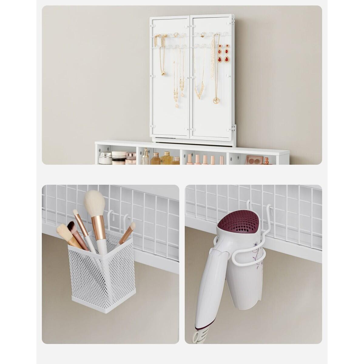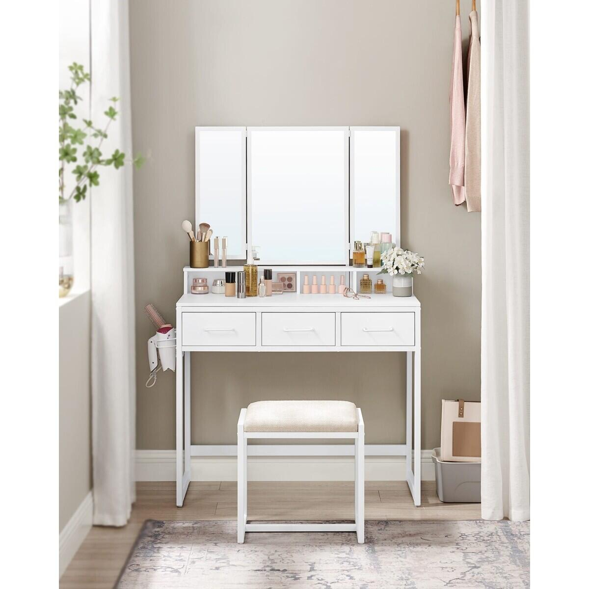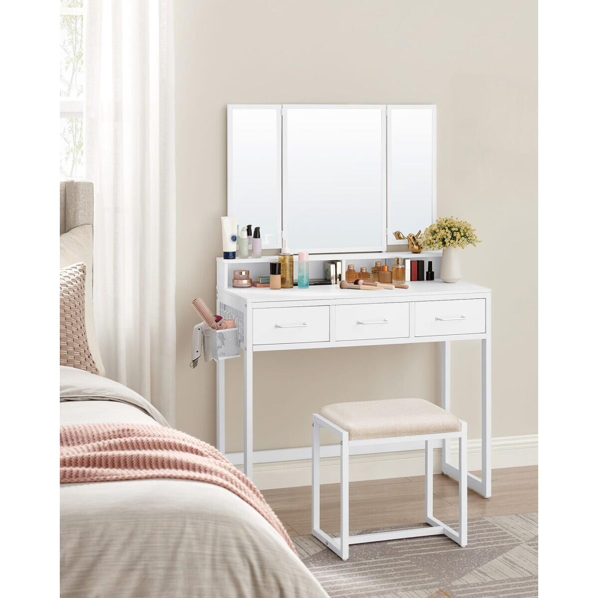 Masa de toaleta/machiaj, Artool, alba, cu 3 oglinzi, taburet, 3 sertare, 90x40x141 cm