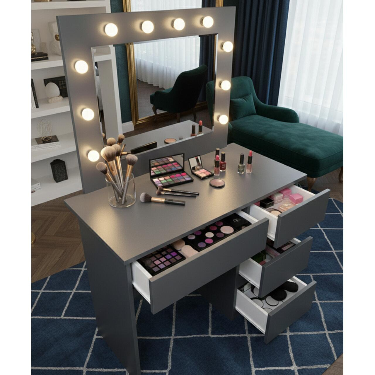 Design modern si finisaj Antracit: Cu un aspect natural si elegant, aceasta masa de machiaj se potriveste cu diverse stiluri de decor – de la minimalist la contemporan sau clasic modern.