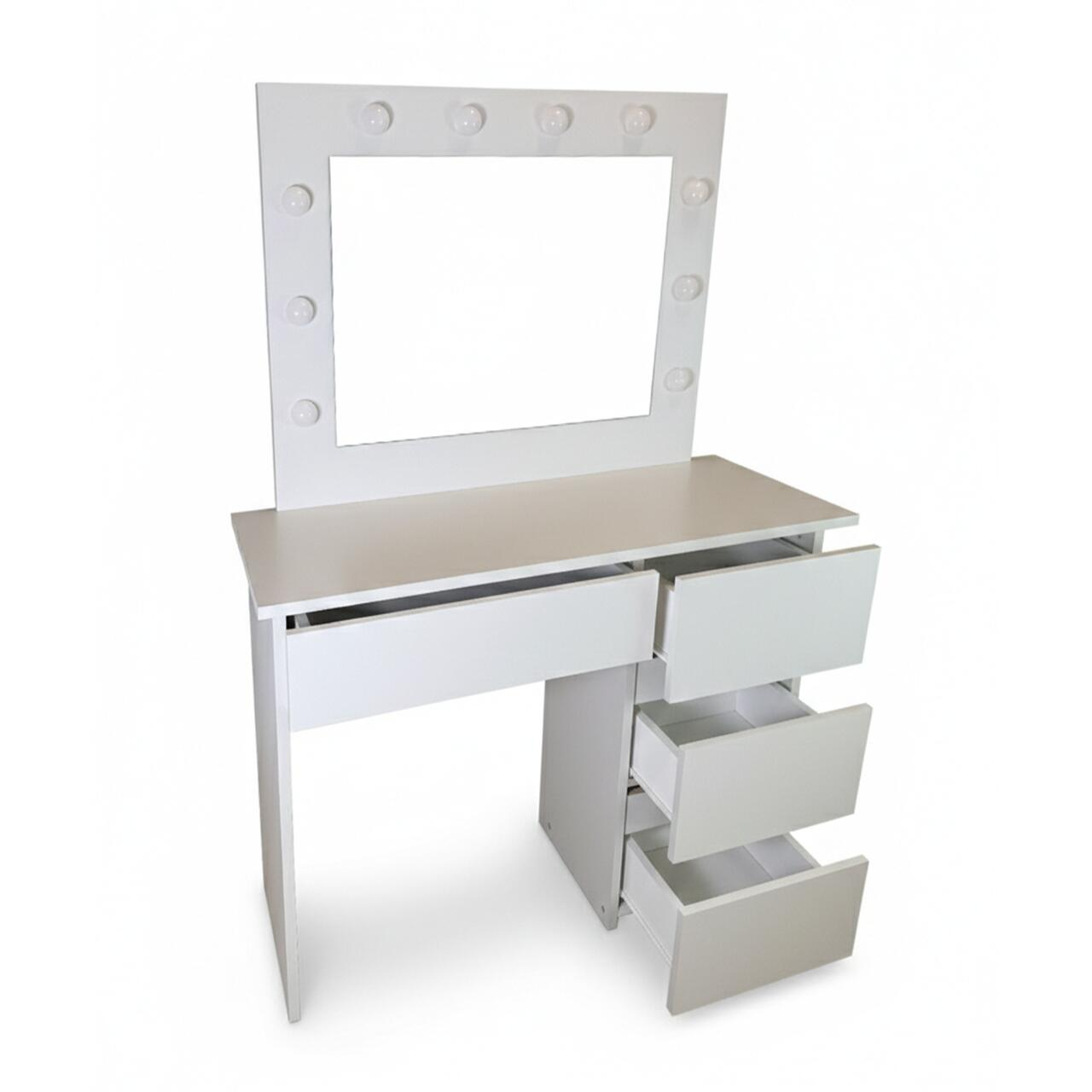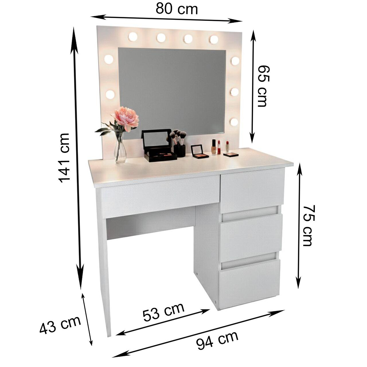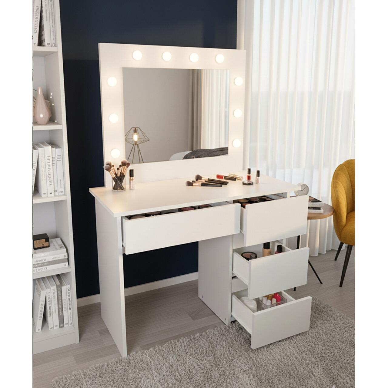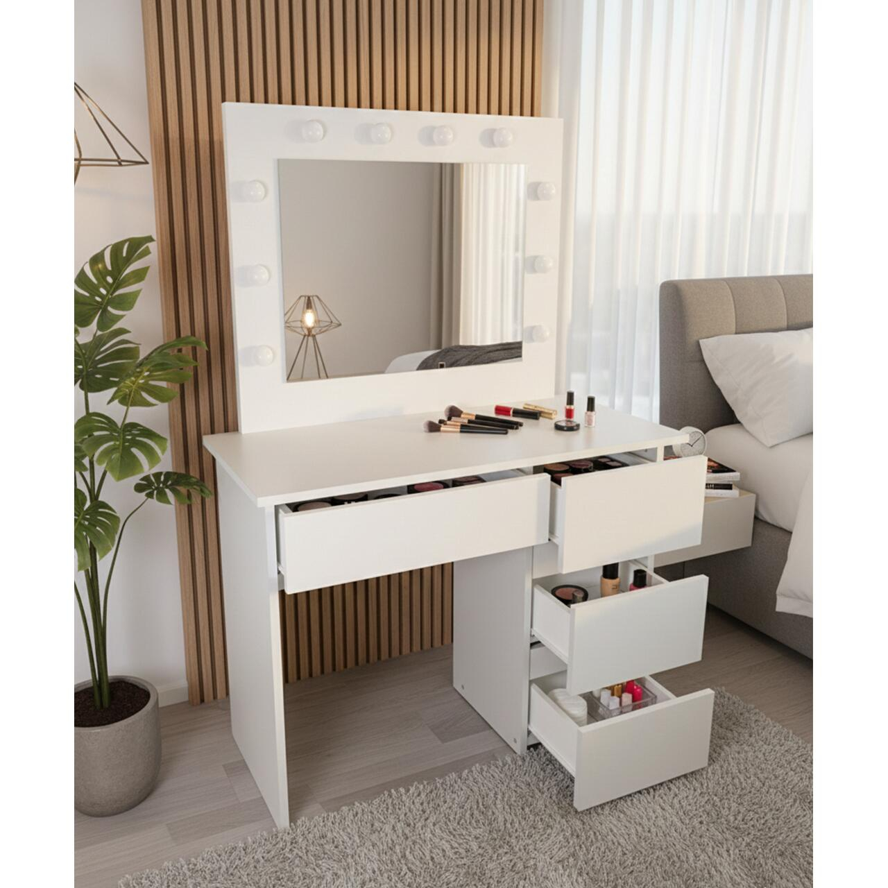 Depozitare eficienta: Cele 4 sertare spatioase iti permit sa iti organizezi produsele preferate, astfel incat totul sa fie la indemana si ordonat. Oglinda mare integrata completeaza perfect zona de machiaj.