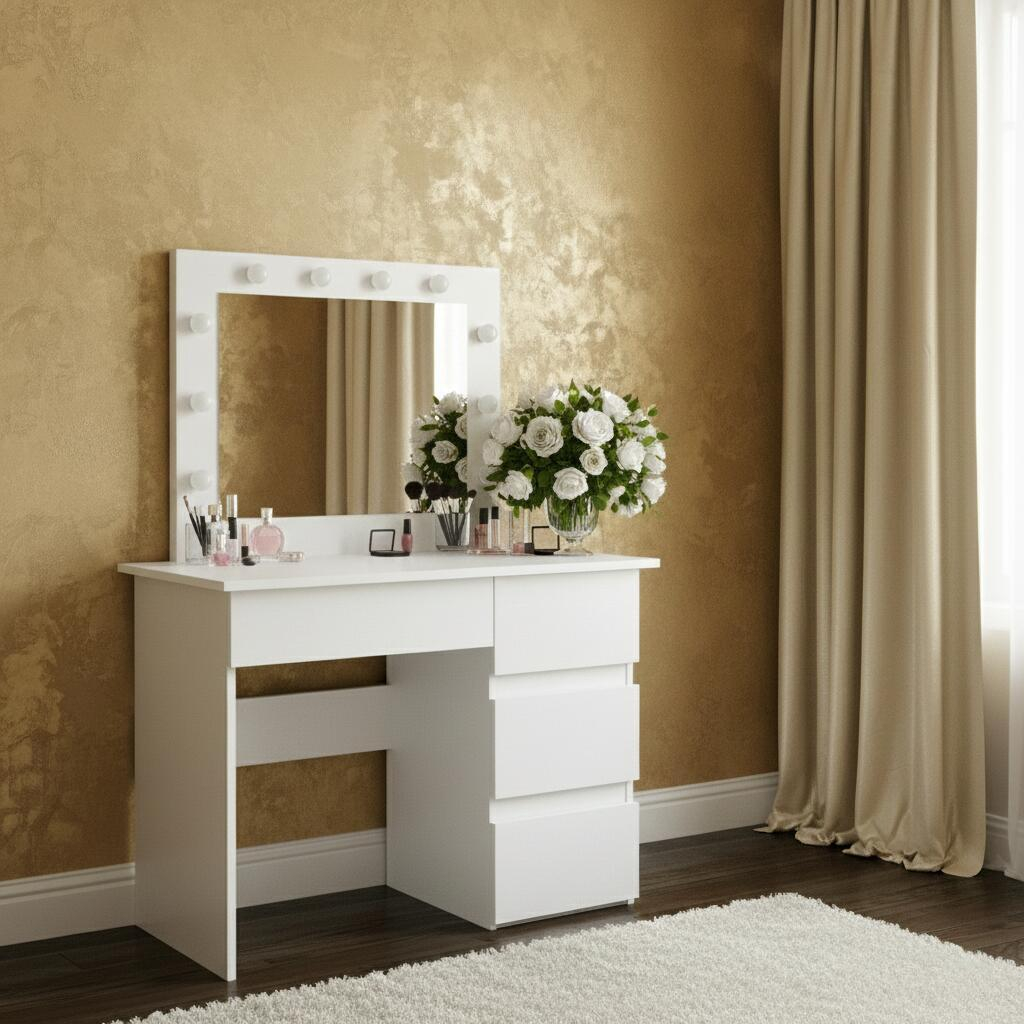 Masa de toaleta alba pentru machiaj cu oglinda si 10 leduri este cu siguranta visul oricarei femei.