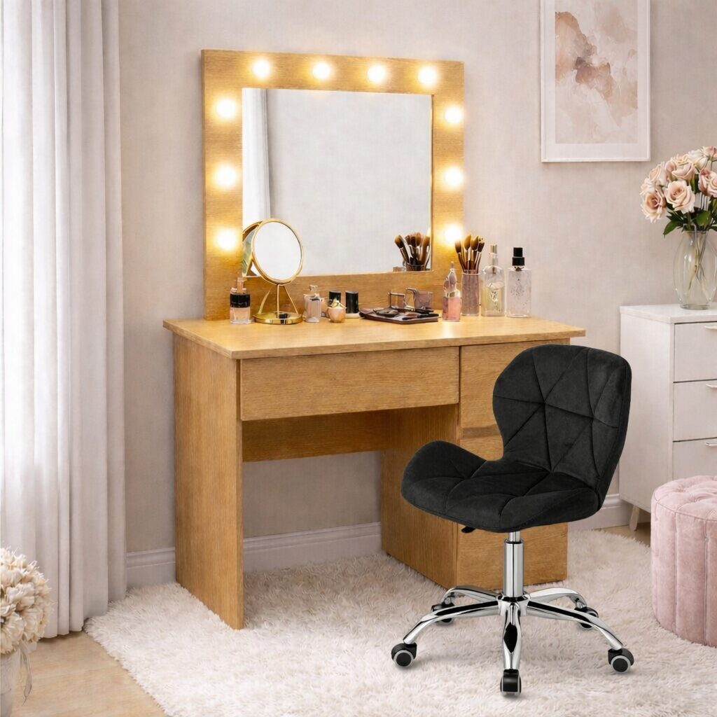 Masa de toaleta/machiaj, Irina, stejar + scaun Avola, negru, cu oglinda si LED-uri, 94x43x141 cm