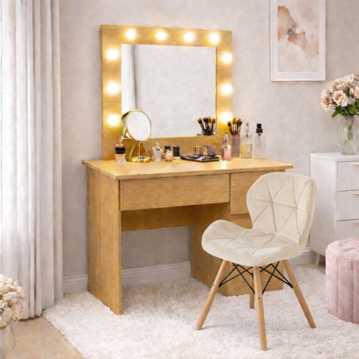 Masa de toaleta/machiaj, Irina, stejar + scaun Lago, bej, cu oglinda si LED-uri, 94x43x141 cm