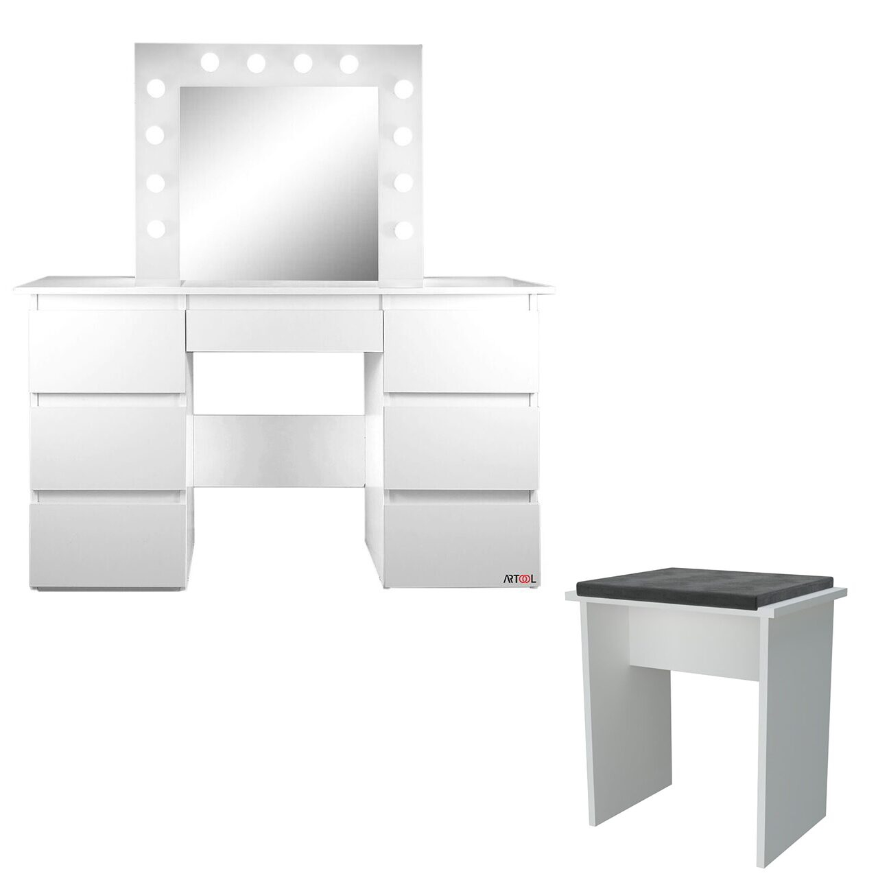 Masa de toaleta/machiaj + Taburet, alba, cu oglinda si LED-uri, Vanessa, 130x43x143 cm