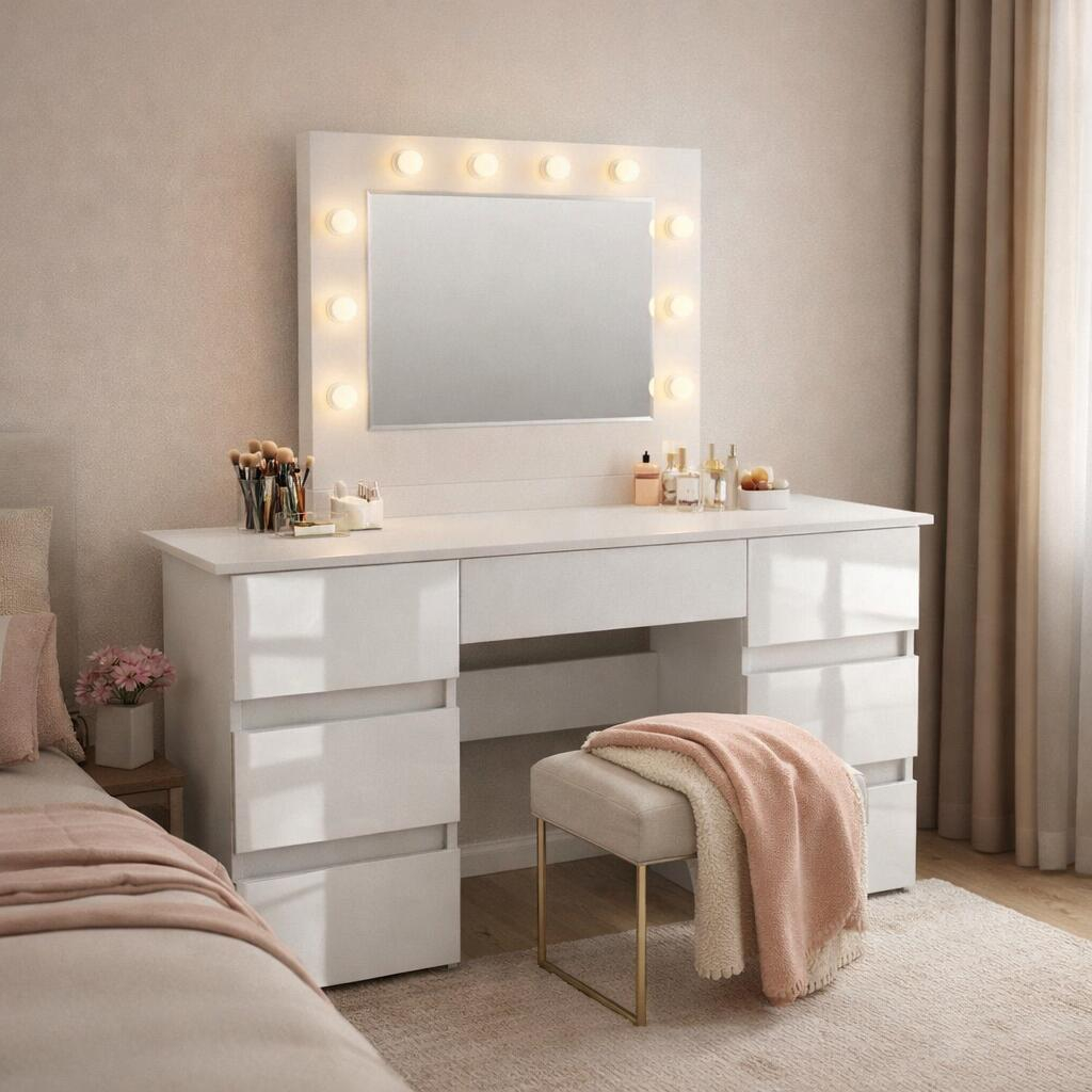 Aceasta masa este prevazuta cu o oglinda mare si 10 becuri LED incorporate, ceea ce o face ideala pentru aplicarea machiajului sau coafurii.