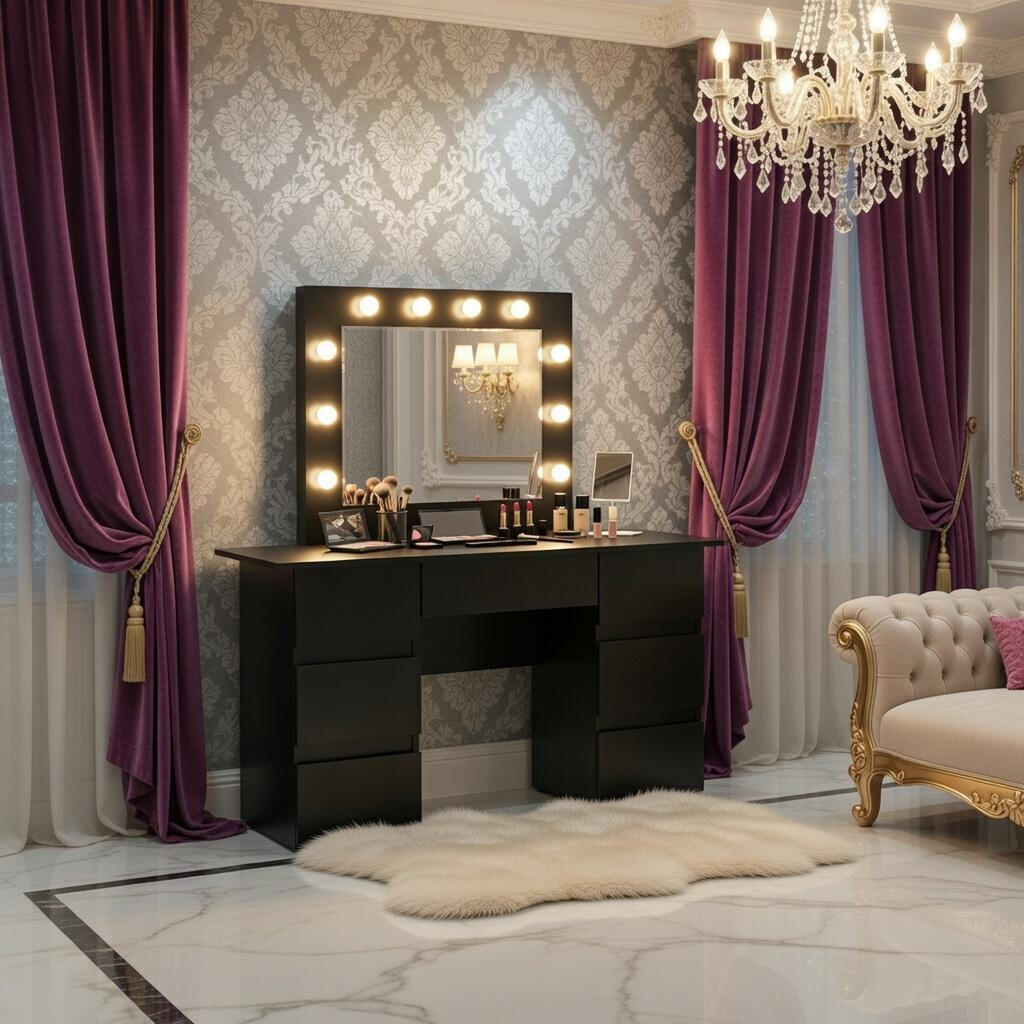 Aceasta masa este prevazuta cu o oglinda mare si 10 becuri LED incorporate, ceea ce o face ideala pentru aplicarea machiajului sau coafurii.