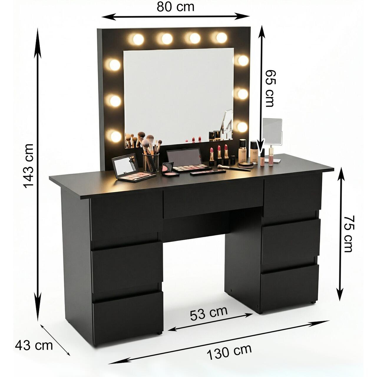 Masa de toaleta/machiaj, Vanessa, negru, cu oglinda si LED-uri, 130x43x143 cm
