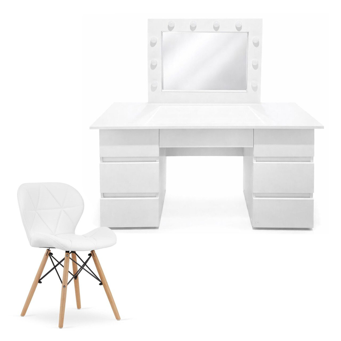 Masa de toaleta/machiaj, Vanessa + scaun Lago, alb, cu oglinda si LED-uri, 130x43x143 cm